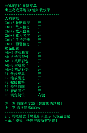 功能介绍:透视.自瞄.物质显示.大小地图雷达 支持系统:W10.W11 注意:每一局,出生地或落地必须按一次P键才有效果!不按没效果! 稳定指数:小号娱乐 注:游戏无边框使用 辅助价格:8.8/8小时/18/天
